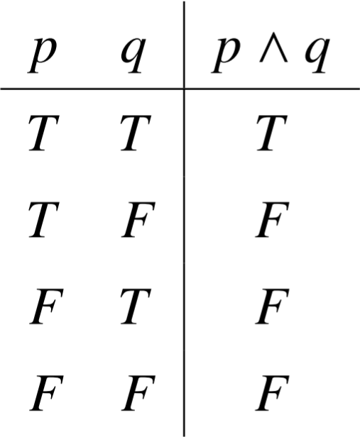 2. 논리곱 : $p$와 $q$가 모두 참이면 $p\land q$는 참이고, $p$와 $q$ 둘 중 하나라도 거짓이면 $p\land q$는 거짓이다.