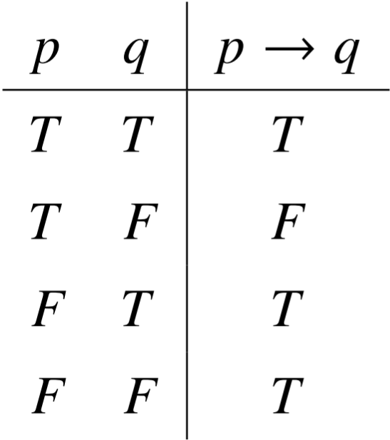 4. 조건부 : $p$가 참일 때 $q$가 참이면 $p\to q$도 참이다. 자연어와 달리 $p$가 거짓이면 $q$의 진리값에 관계 없이 $p\to q$는 참이다. 이때, $p\to q\equiv p\lor\neg q$임에 주목하자. 이는 진리표로 쉽게 증명할 수 있다.