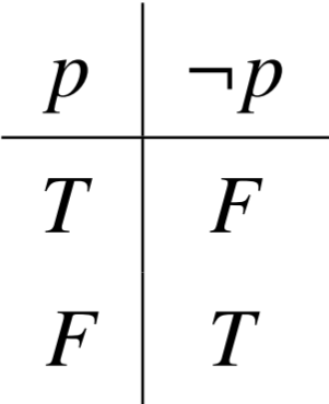 1. 부정 : $p$가 참이면 $\neg p$는 거짓이고, $p$가 거짓이면 $\neg p$는 참이다.
