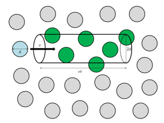 나머지 입자들은 균일하게 분포된 상태로 고정되어 있고, 한 입자만 $v$의 속력으로 움직이는 계를 생각했을 때, 이 공간에 밑면의 직경이 $2d$ 이고 높이는 입자가 $t$ 초 동안 이동한 거리, 즉 $vt$ 와 같은 원기둥을 설정할 수 있다.