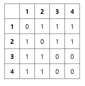 행렬의 i번째 행,j번째 열에 해당하는 위치에 1이 있으면 i와 j 사이에 간선이 있는 것이고, 0이 있으면 간선이 없는 것이다.